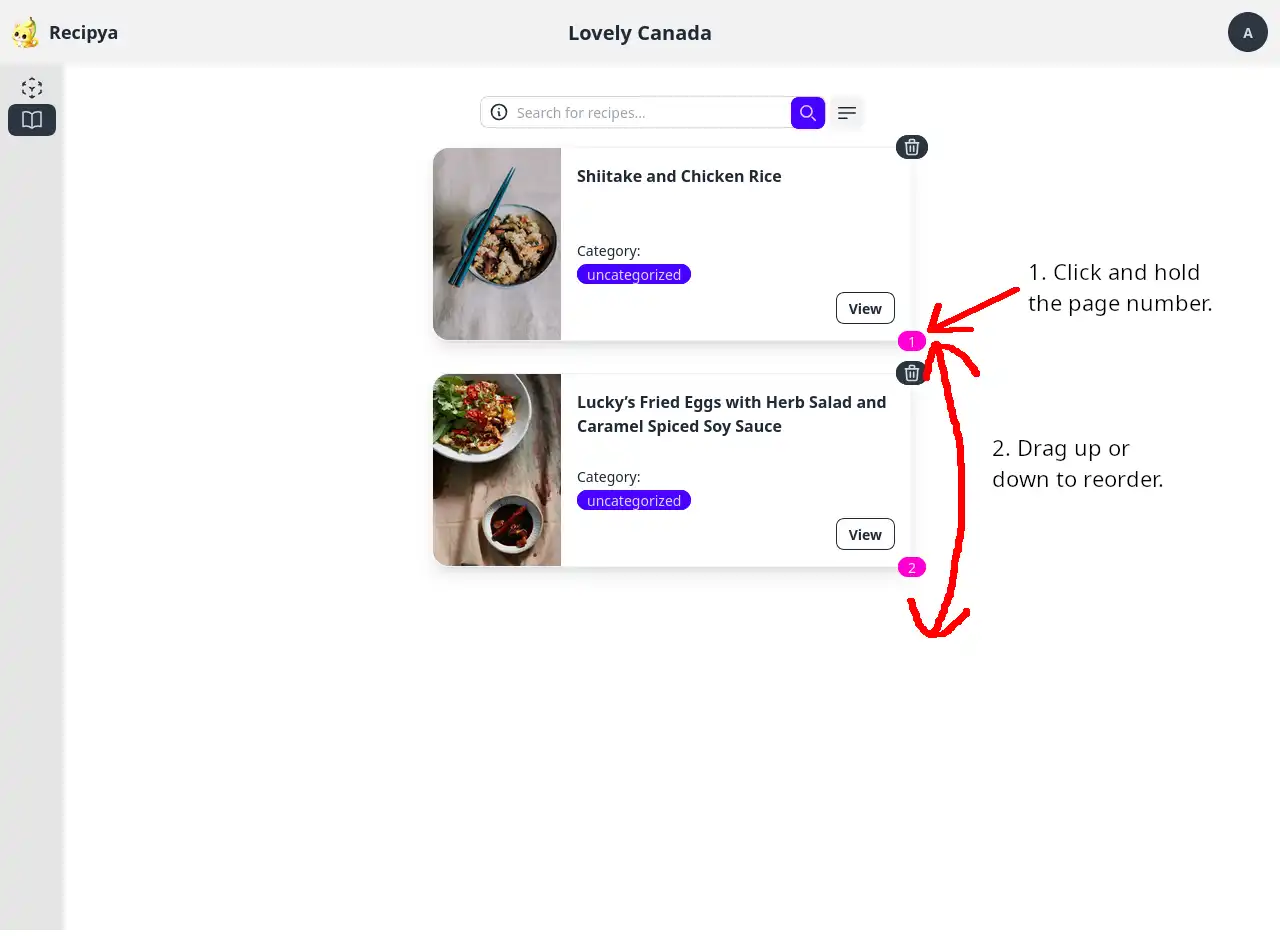 To reorder them, first open a cookbook. In the following image, we want to switch the position of the first recipe with that of the last.