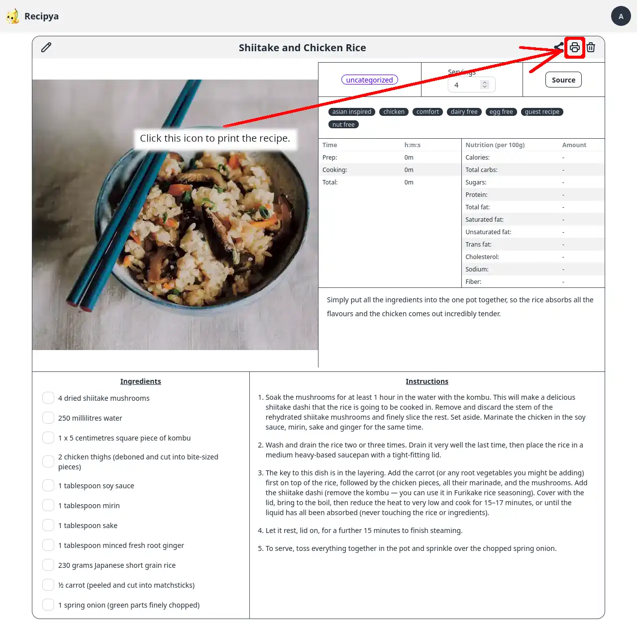 Pour imprimer, vous devez d’abord afficher une recette. Ensuite, cliquez sur l’icône d’imprimante à droite du titre de la recette.